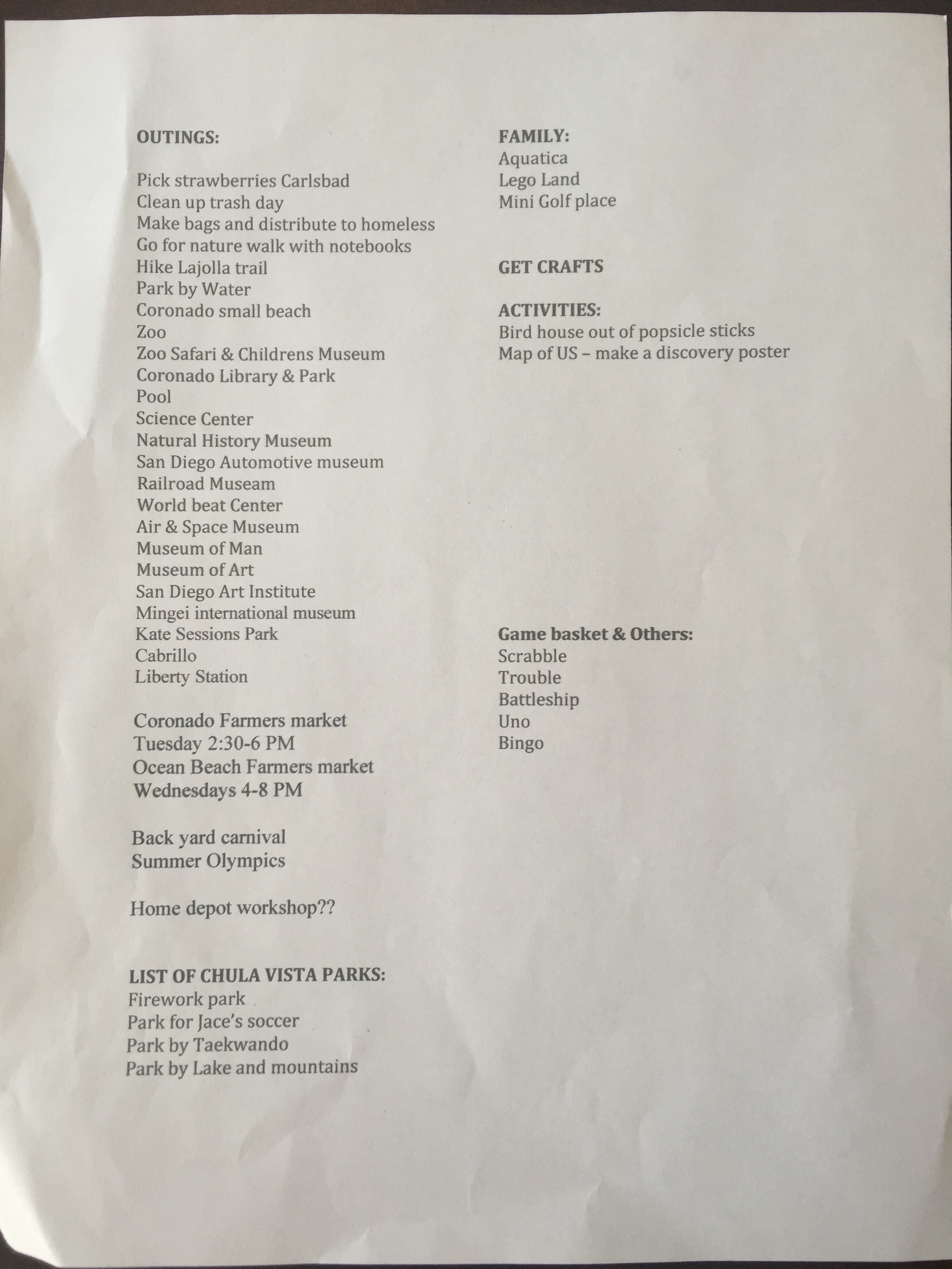 The 1st thing I did was: ask what do we want to do this summer? My kids helped me out with this and we created a list of parks and places we wanted to go. I simply typed it out and printed it. Ours looks like this: