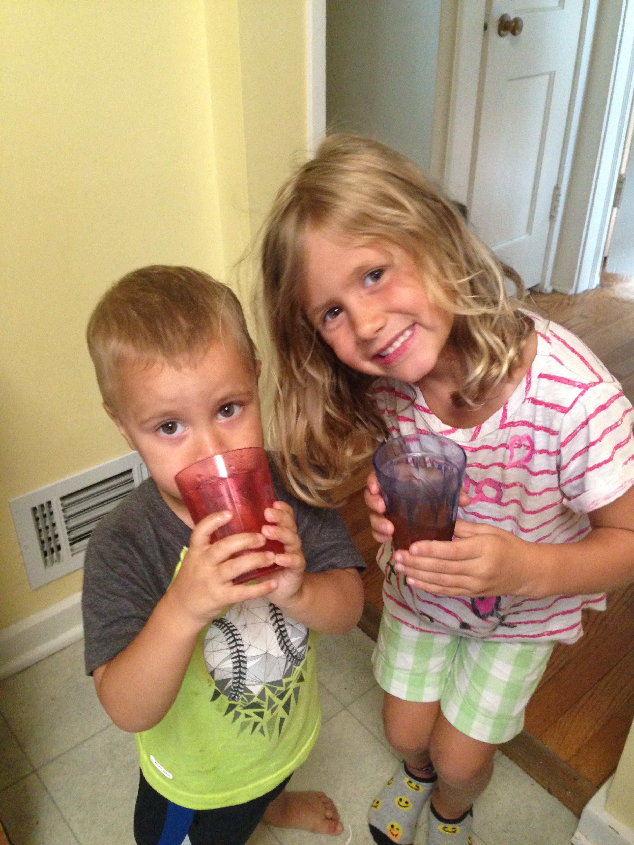 Here’s how you brew it: In a large saucepan, bring 3 quarts (12 cups) of water to a boil. Stir in one cup of sugar until dissolved. Add 4-5 tea bags and allow the tea to brew. Then allow the tea to cool to room temperature. After it has cooled, pour the sweetened tea into your large glass jar and add the SCOBY and starter liquid. Do not seal the top but cover it with a white cotton towel or a brown coffee filter with a rubber band to hold it tight. Store it in a warm, dry place (I keep mine on my kitchen counter) and allow the tea to ferment for 7-10 days. I am told you can do even longer, but for our family we prefer the taste after exactly a week. You can taste-test it after a week and see if you would prefer it to be a stronger flavor; If so, just let it brew another few days.
